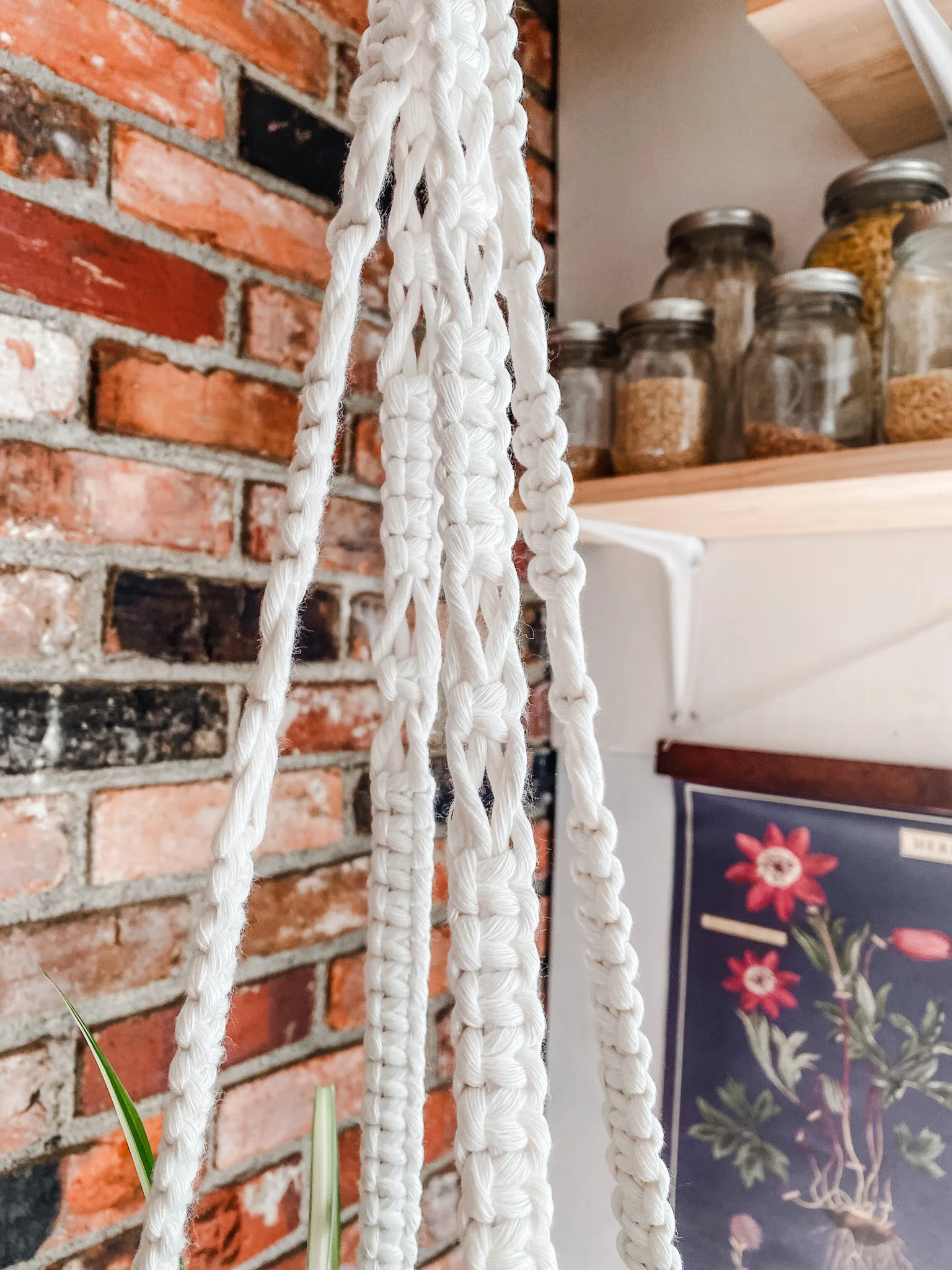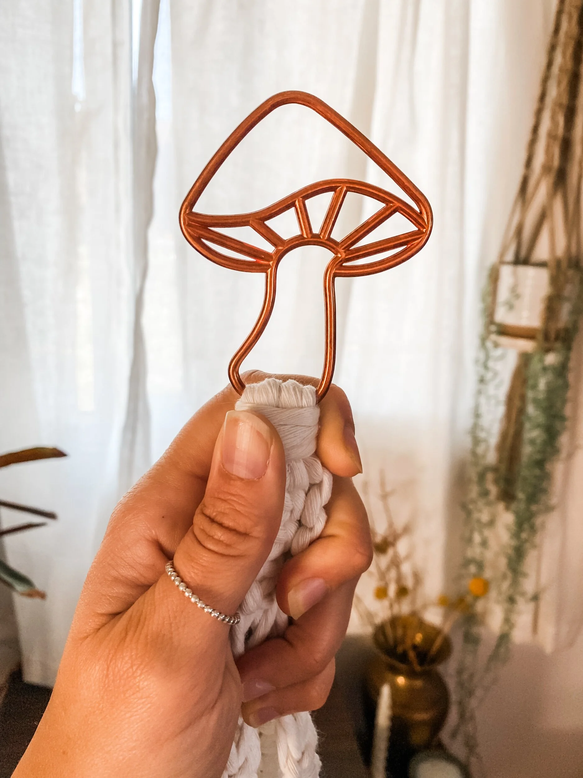 This plant hanger is approximately 35” long & holds up to a 10” pot. Made with a copper mushroom frame & recycled cotton cord.